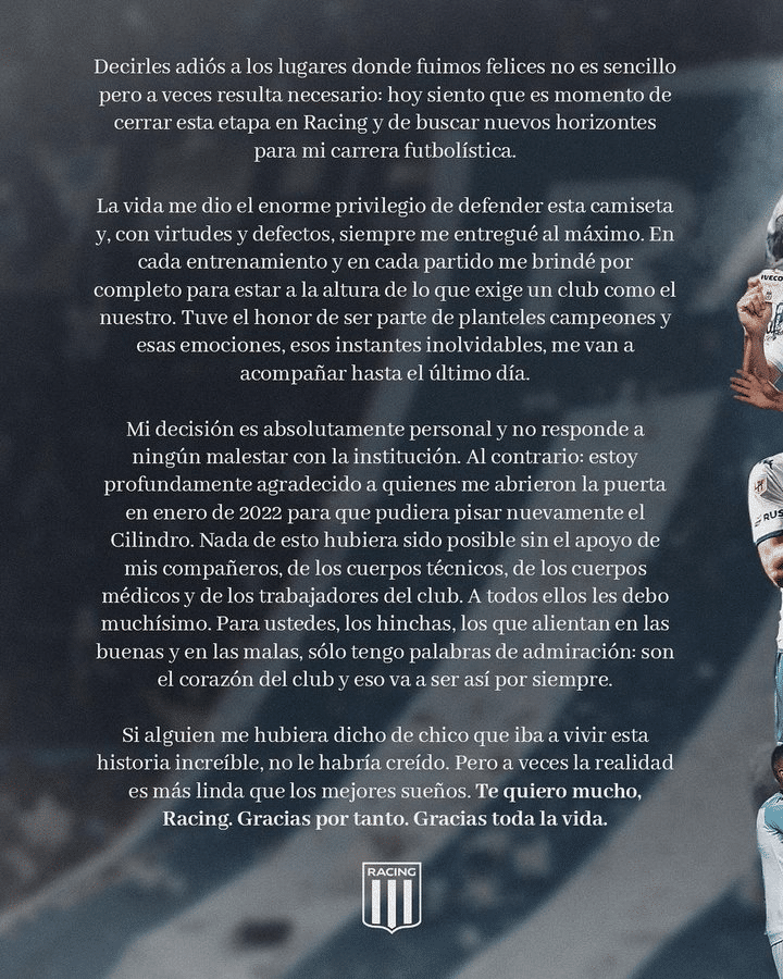 El mediocampista pasará reconocimiento médico con Racing y firmará contrato hasta diciembre del 2025. Volverá al club donde debutó en el año 2008.