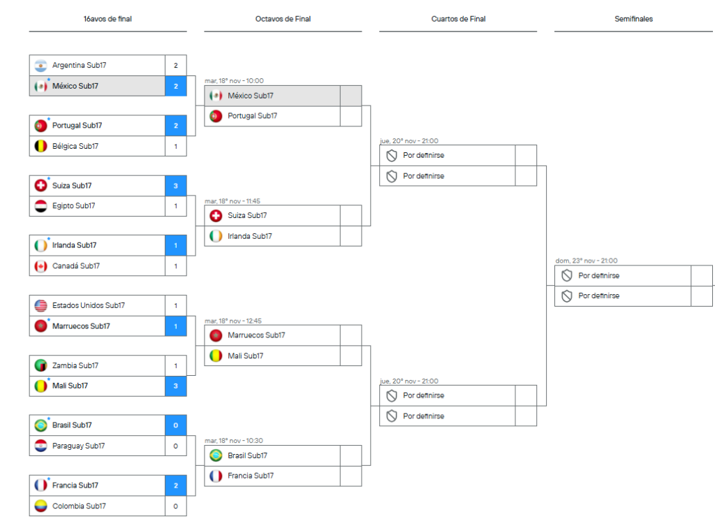 Las fases de cuartos de final están previstas para el viernes 21 de noviembre, con los cuatro partidos programados en el Aspire Zone de Rayán, sede de toda la Copa Mundial Sub-17. Hay mucha expectativa, y México tiene opciones de clasificar. Aunque aún no ha mostrado su mejor juego, el equipo ya ha demostrado que puede dar sorpresas y meterse entre los ocho mejores del torneo.
