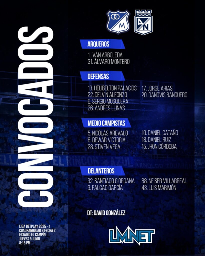 Millonarios ya tiene todo listo para su crucial enfrentamiento ante Atlético Nacional por la segunda fecha del cuadrangular final de la Liga BetPlay. El técnico David González ha convocado a 18 jugadores para este esperado duelo, en el que los capitalinos buscarán consolidarse en la cima del grupo con una segunda victoria consecutiva.