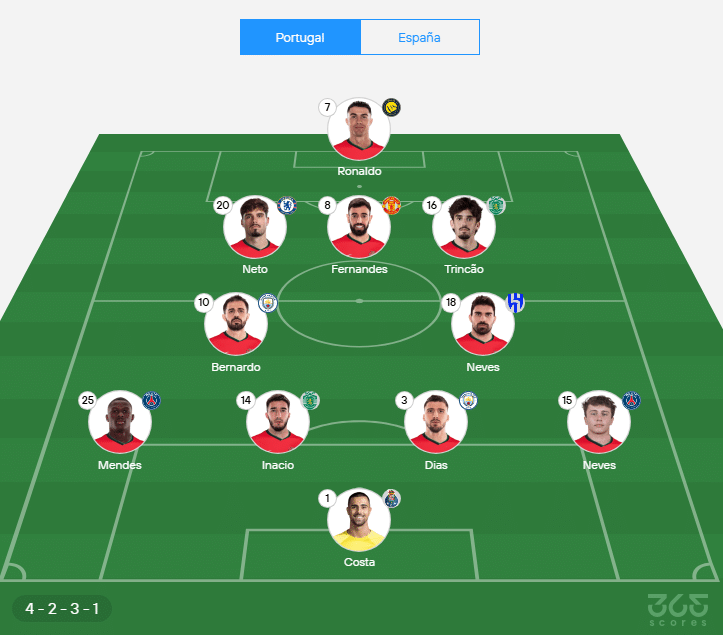 - Defensores: Nuno Mendes, Goncalo Inacio, Ruben Dias, João Neves.
