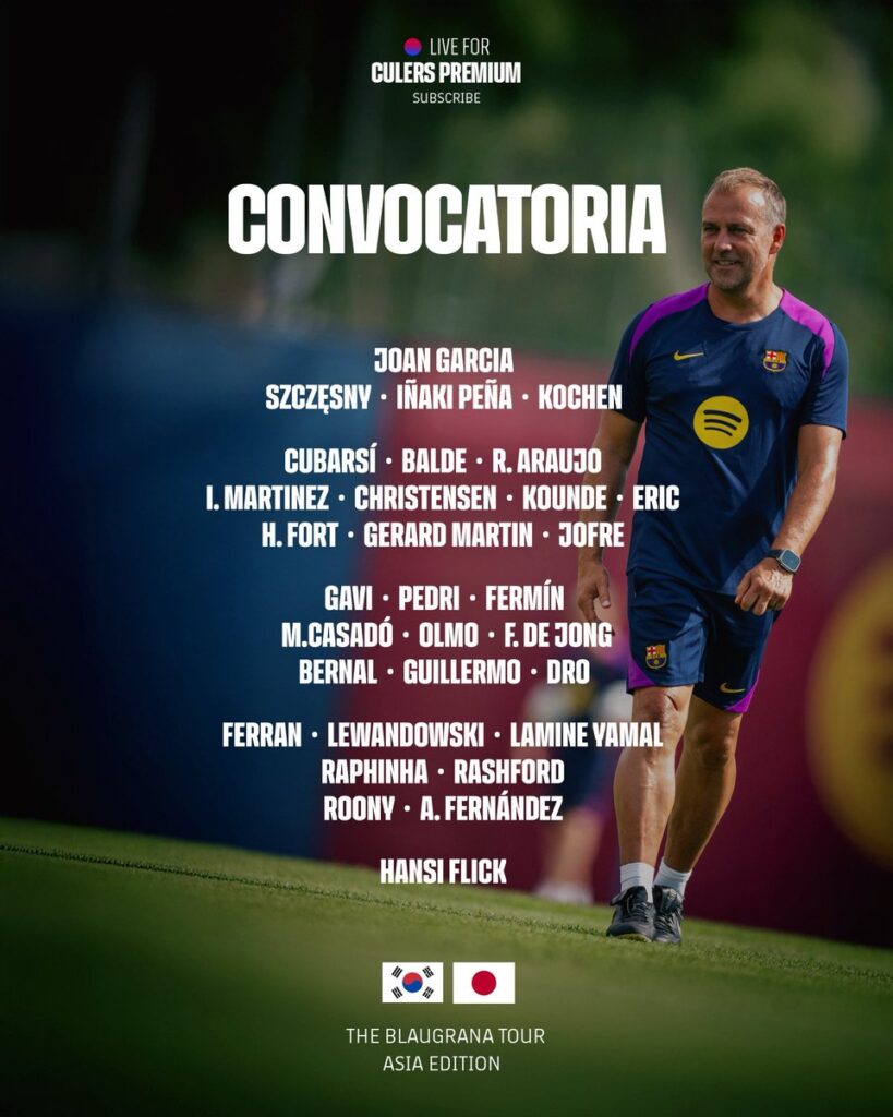 El equipo azulgrana viajó con 30 jugadores convocados para la gira por Japón y Corea, incluyendo varios canteranos y los nuevos fichajes Marcus Rashford, Joan García y Roony Bardghji. Por su parte, no viajaron Ter Stegen (operación de espalda), Oriol Romeu y Pau Víctor, ambos en vías de salida del club .