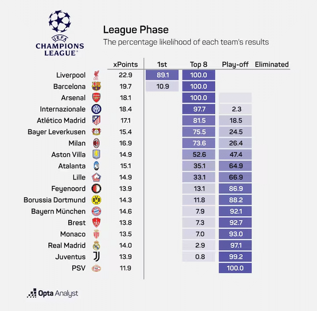 La sensación de milagro no es una mera cuestión subjetiva, sino también matemática. Según las proyecciones de Opta, el Real Madrid cuenta con apenas un 2.9% de probabilidades de clasificar a los octavos de final de la Champions League, sin tener que pasar por una instancia previa de Playoffs. Una probabilidad muy baja.