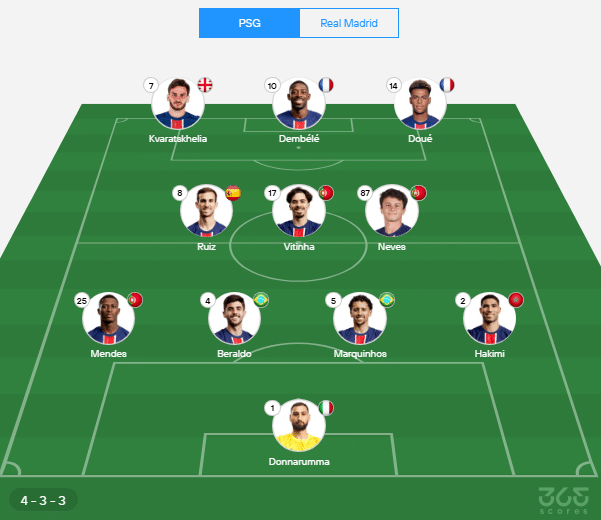 - Mediocampistas: Fabián Ruiz, Vitinha, João Neves.