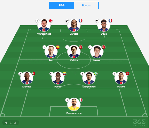 - Delanteros: Khvicha Kvaratskhelia, Bradley Barcola, Désiré Doué.