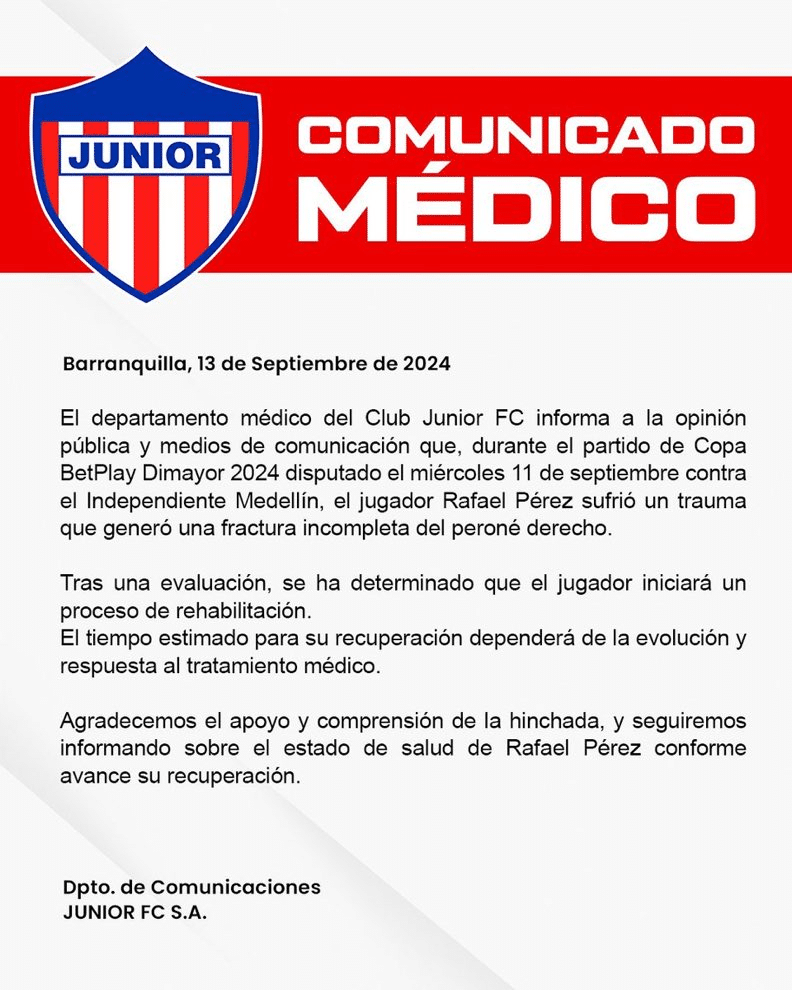 “El departamento médico del Club Junior FC informa a la opinión pública y medios de comunicación que, durante el partido de Copa BetPlay Dimayor 2024 disputado el miércoles 11 de septiembre contra el Independiente Medellín, el jugador Rafael Pérez sufrió un trauma que generó una fractura incompleta del peroné derecho.