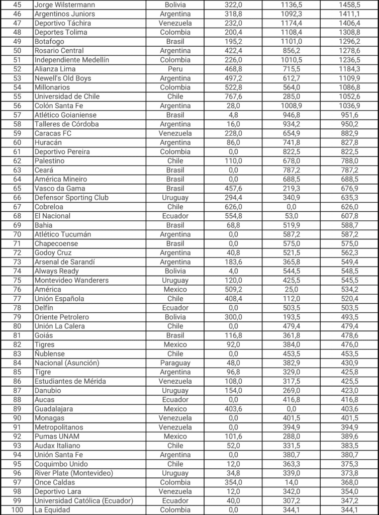 El Top 100 del Ranking de Clubes publicado por Conmebol (Al 18/12/2023)