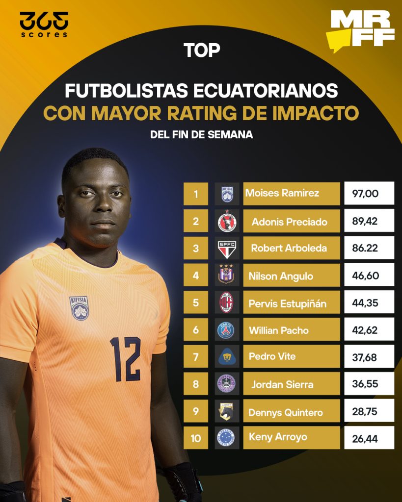 En el marco de la alianza entre 365Scores y MR Offsider, repasamos el ranking semanal de los ecuatorianos con mayor Rating de Impacto, liderado por un arquero que fue figura absoluta pese a la derrota de su equipo.