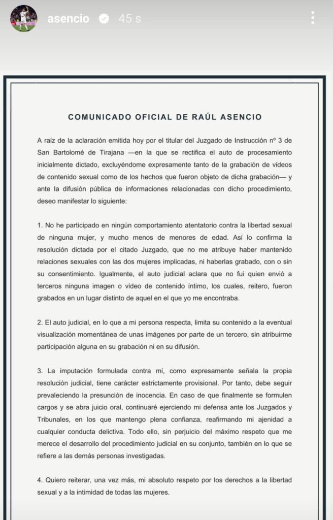 Raúl Asensio publicó un texto en el que explicaba su situación procesal. En él, señalaba que el Juzgado de Instrucción N.º 3 de San Bartolomé de Tirajana ya había modificado el auto de procesamiento, excluyéndolo de la grabación y los hechos relacionados con los videos sexuales.