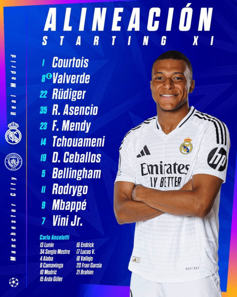 - Suplentes: David Alaba, Eduardo Camavinga, Luka Modric, Andriy Lunin, Arda Güler, Endrick, Jesús Vallejo, Francisco García, Brahim Díaz, Sergio Mestre.