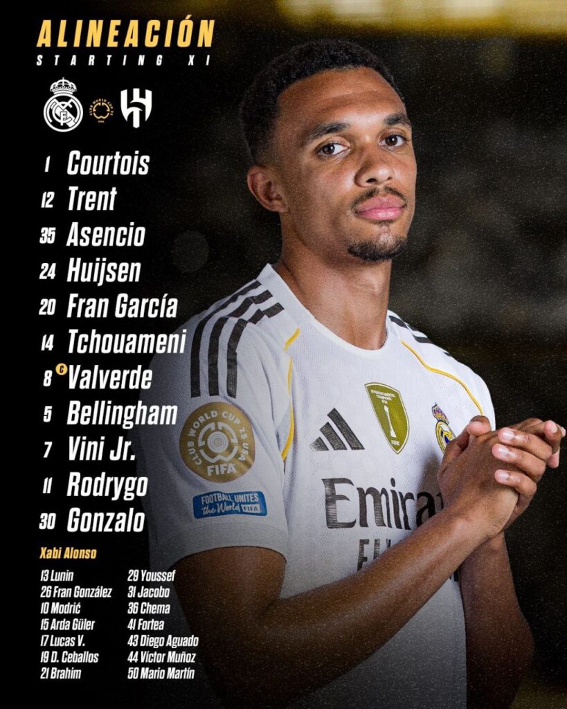 Estos son los once titulares elegidos por Xabi Alonso para su primer partido oficial al mando del Real Madrid, en el estreno del conjunto merengue en el Mundial de Clubes 2025, correspondiente al Grupo H frente a Al Hilal.