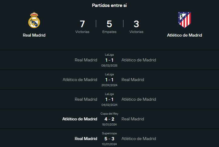 Datos del Real Madrid vs Atlético de Madrid por LaLiga de España