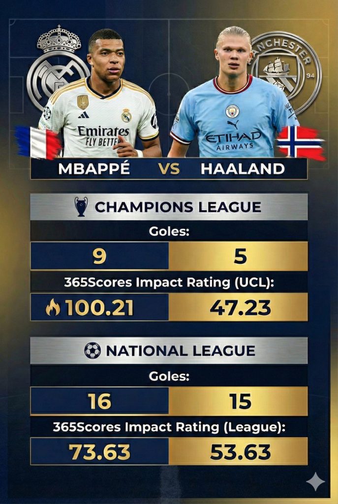 | Estadística | 🇫🇷 Kylian Mbappé (Real Madrid) | 🇳🇴 Erling Haaland (Man. City) |