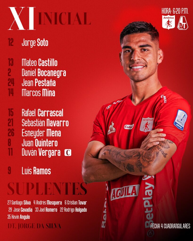 Rodrigo Holgado no arrancará como titular esta noche frente a Deportes Tolima, en el duelo correspondiente a la fecha 4 de los Cuadrangulares de la Liga BetPlay 2025. El goleador del América de Cali ocupará un lugar en el banco de suplentes y se espera que tenga minutos en el complemento.