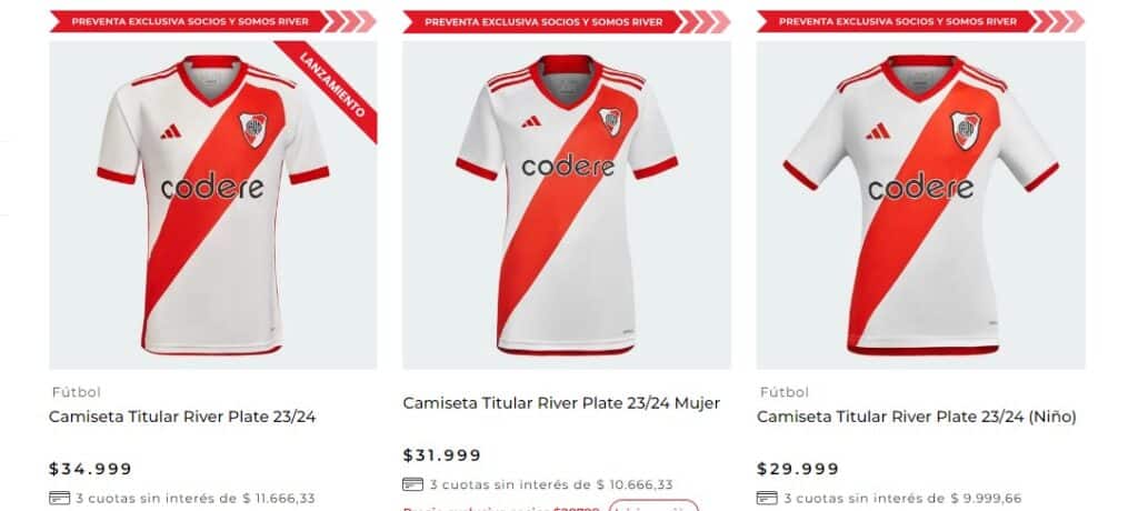 La camiseta millonaria para la temporada 2023/24 ya está a disposición de los hinchas de River. La versión AERO READY, que es la edición destinada a los hinchas, tiene un valor de $34.999 pesos argentinos (sin descuentos). Por su parte, el short que acompaña el lanzamiento vale $19.999 y las medias: $7.999.