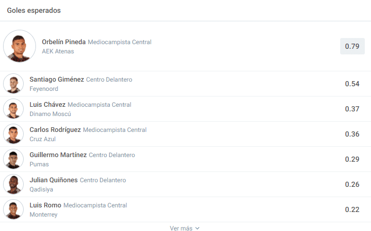 En ese ítem, Santiago Giménez sigue siendo uno de los jugadores con más goles esperados dentro de toda la Selección de México. A pesar de la sequía, tiene 0.54 Gx y está solo por debajo de Orbelín Pineda, volante centra del Tri, que tiene 0.79 Gx. Para engrosar ese coeficiente deberá comenzar a anotar y darle chances a México dentro de una Copa América en la que aparece complicada de cara a la última jornada de la fase de grupos.