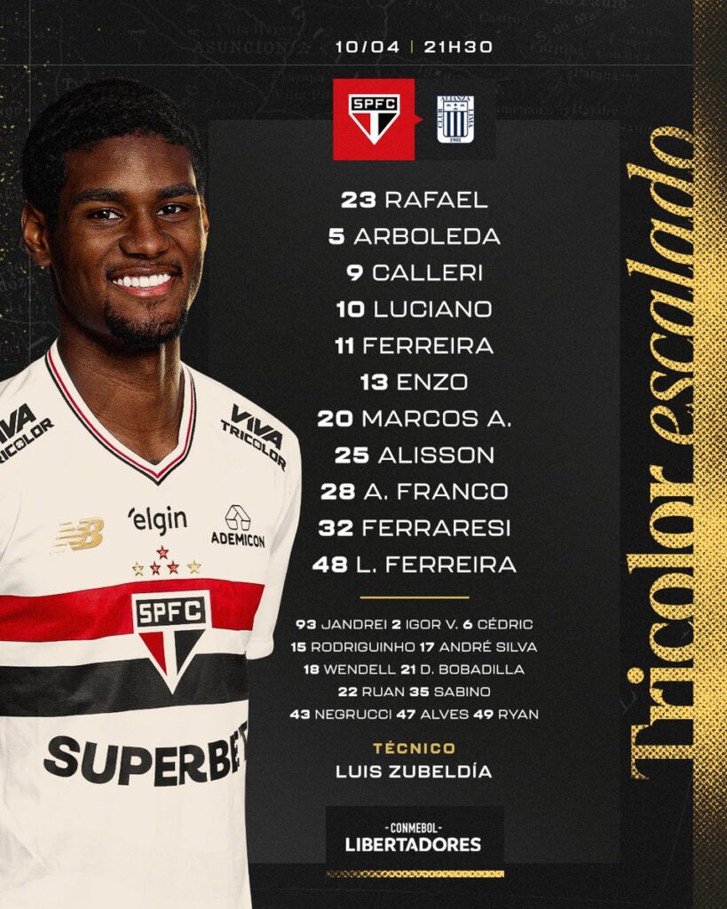 Sao Paulo hoy ya tiene todo confirmado para afrontar su segundo compromiso por la fase de grupos de la Copa Libertadores 2025. A falta de una hora para el inicio del juego entre el Tricolor y Alianza Lima, el entrenador Luis Zubeldía dio a conocer quiénes serán los titulares y suplentes en el conjunto paulista, que se presentará en el estadio Morumbí. ¿Quién ganará?