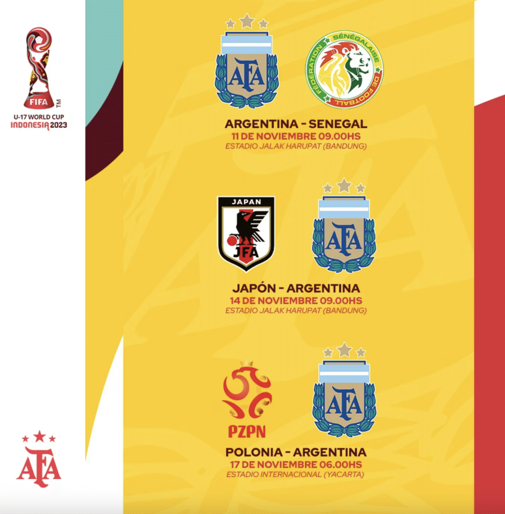 El martes 14 se dará el segundo partido, desde las 9 de la mañana, también en Bandung, se medirá a Japón, que también viene de ser vencedor a nivel continental en esta categoría. El grupo para Argentina terminará el viernes 17 de noviembre a partir de las 6 de la mañana (hora argentina) en el Estadio Internacional de Jakarta contra Polonia. La Selección europea viene de ser semifinalista del Europeo Sub 17, ya que perdió las semifinales ante Alemania, posterior campeón del torneo.