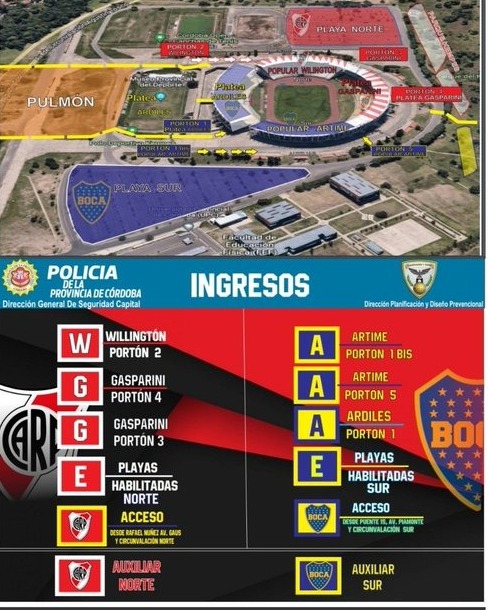 En cuanto a los accesos al Estadio Kempes, los hinchas de Boca ocuparán la popular Artime y la platea Ardiles. Ingresarán por los portones 1 y 1 bis (platea) y 5 (popular). También contarán con el playón de estacionamiento del sector sur del estadio.