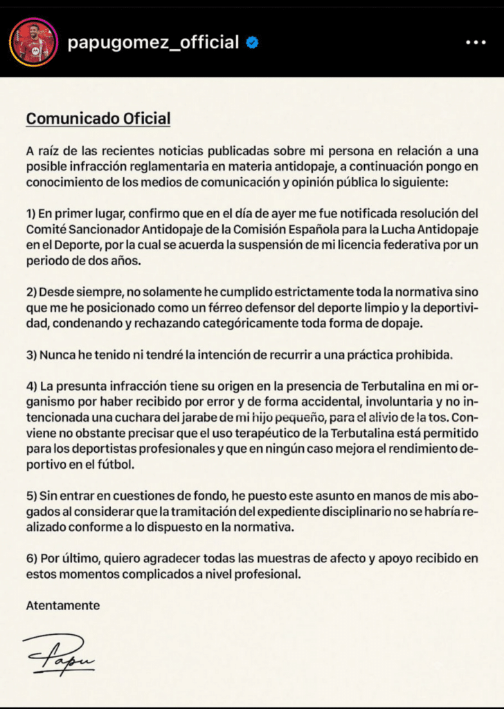 Alejandro ‘Papu’ Gómez publicó un comunicado en sus redes sociales tras ser notificado por un doping positivo.