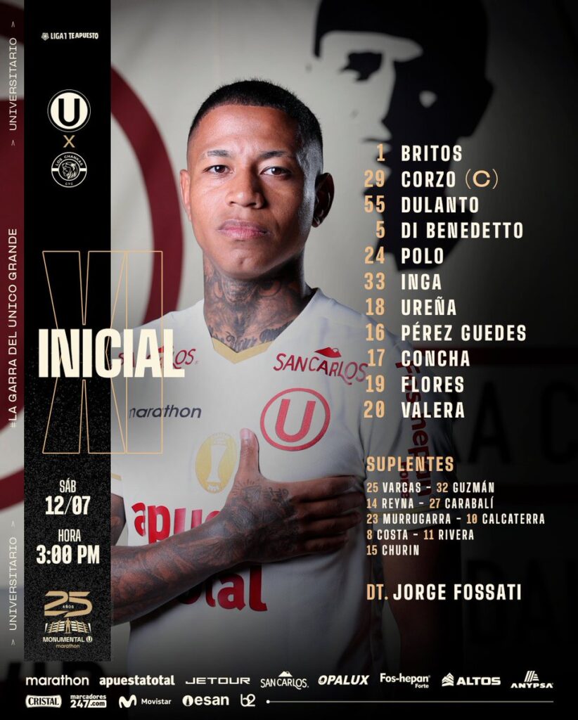 Universitario hoy afronta un duelo clave ante Los Chankas por la fecha 19 de la Liga 1. El conjunto crema, líder absoluto del certamen, va por tres puntos claves que le permitan conseguir el primer título de la temporada. A una hora para el inicio del encuentro, Jorge Fossati ya definió los once que van por la coronación.