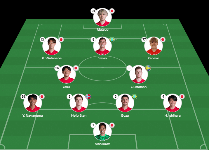 - Mediocampistas: Kaito Yasui, Samuel Gustafsson, Ryoma Watanabe, Matheus Sávio.