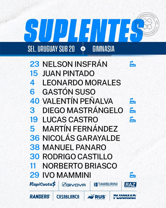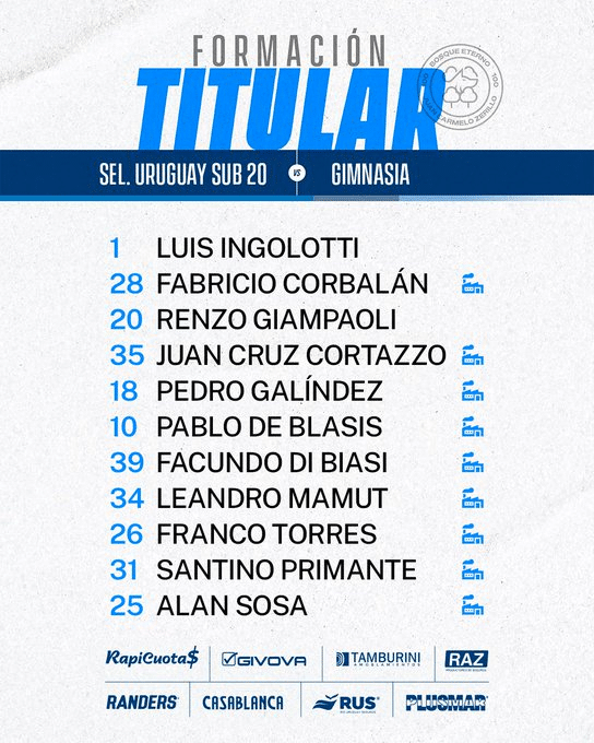 Alineación de Uruguay Sub 20 vs Gimnasia