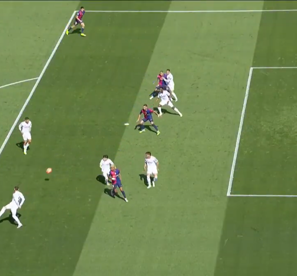 A los 22 minutos del primer tiempo, Lucas Vázquez agarró a Raphinhia cerca del punto penal, tras el centro de Dani Olmo. El jugador brasilero cayó, lo cual, minuto después, derivó a que el arbitro José Hernández Hernández lo llamen desde el VAR.