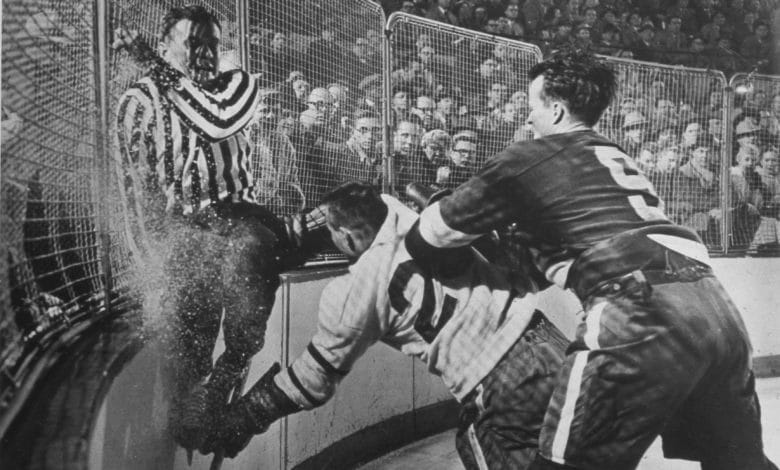 DETROIT, circa 1955, The Detroit Red Wings' star Gordie Howe, number 9, checks a Chicago Black Hawk opponent into the boards during a National Hockey League game in Detroit in the mid-1950s, as the referee lifts himself out of the way. (Photo by Transcendental Graphics/Getty Images)