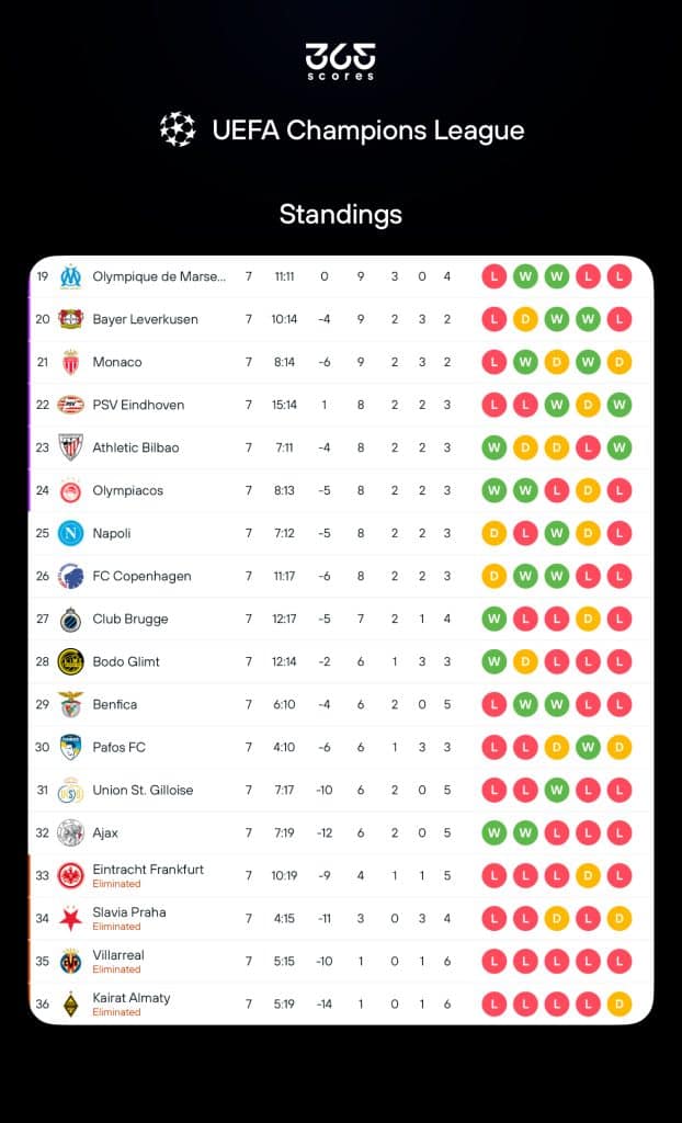 The remaining places are being fought over by a 17-team pack who can still finish anywhere from “play-offs” to “out,” depending on results and tiebreakers: Borussia Dortmund, Galatasaray, Qarabag, Marseille, Bayer Leverkusen, Monaco, PSV, Athletic Club, Olympiacos, Napoli, FC København, Club Brugge, Bodo/Glimt, Benfica, Pafos, Union Saint-Gilloise, Ajax.
