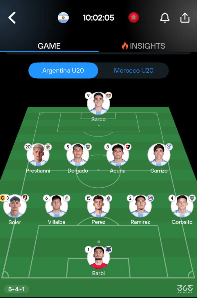 Argentina (5-4-1): Santino Barbi; Dylan Gorosito, Tobías Ramírez, Tomás Pérez, Juan Manuel Villalba, Julio Soler; Milton Delgado, Valentino Acuña; Maher Carrizo, Gianluca Prestianni and Alejo Sarco.