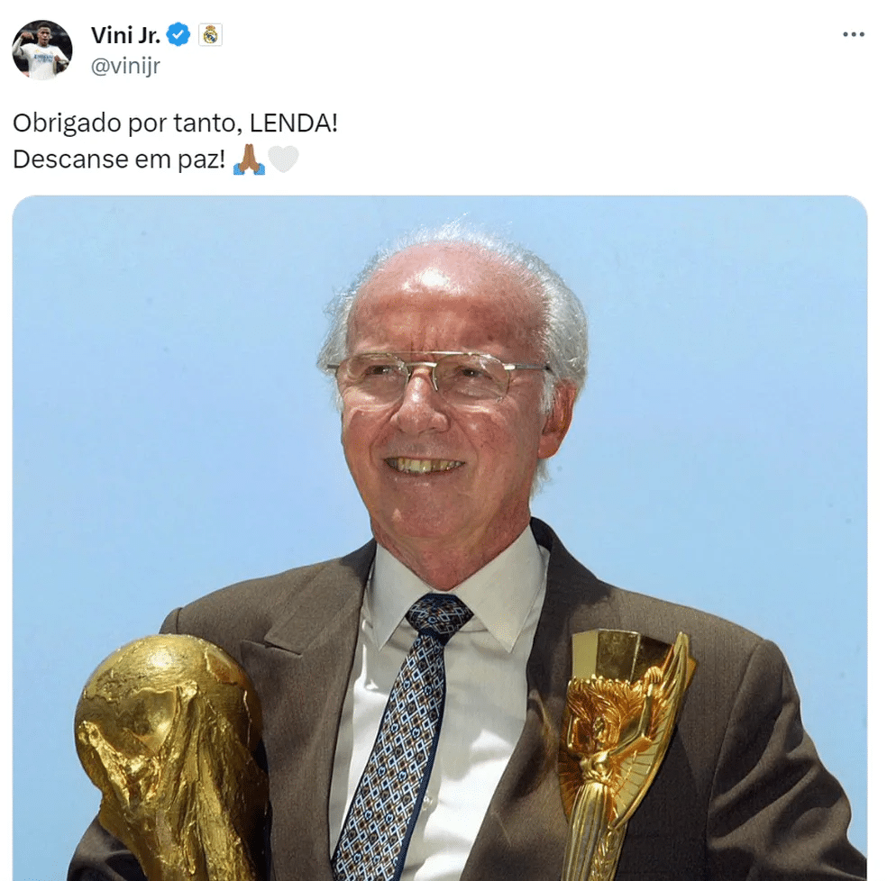 Atletas como Vinicius Junior, Rodrygo, Paquetá e Éder Militão fizeram postagens para homenagear o Velho Lobo, que morreu na sexta-feira aos 92 anos.