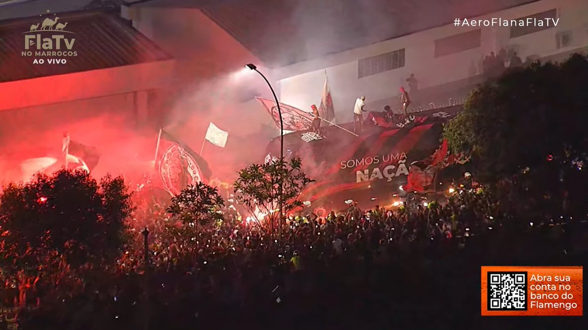 A delegação do Flamengo embarca na noite desta quinta-feira (2) rumo ao Marrocos, onde disputará o Mundial de Clubes em busca do bicampeonato. Em clima de festa, os torcedores rubro-negros prepararam o tradicional ‘AeroFla’ e foram às ruas apoiar o time nos últimos instantes antes da viagem ao torneio.