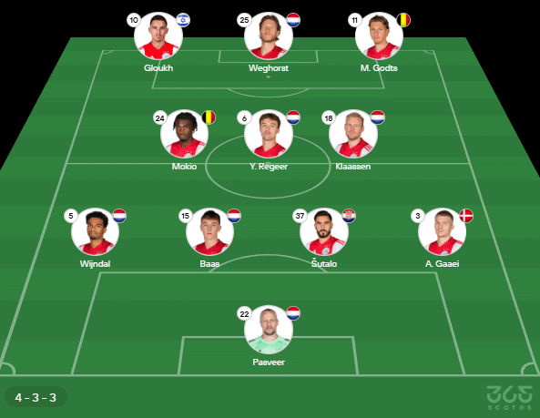 Provável escalação do Ajax: Pasveer; Gaaei, Sutalo, Baas, Wijndal; Klassen, Regeer, Jorthy Mokio; Godts, Gloukh, Weghorst. Técnico: Fred Grim
