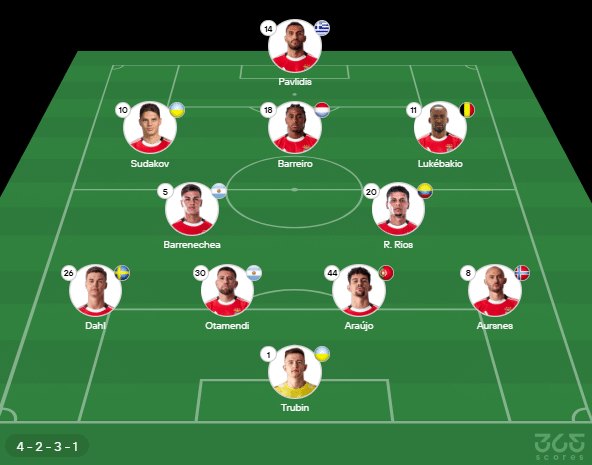 - Provável escalação do Benfica: Trubin; Aursnes, Tomás Araújo, Otamendi, Dahl; R. Rios, Barrenechea, Barreiro; Lukébakio, Sudakov, Pavlidis
