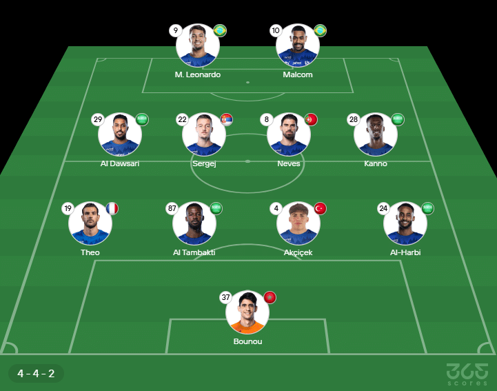 Escalação do Al-Hilal: Bounou, Al-Harbi, Akcicek, Al Tambakti e Theo Hernández; Kanno, Rúben Neves, Sergej Milinkovic-Savic e Al Dawsari; Malcom e Marcos Leonardo. Técnico: Simone Inzaghi.