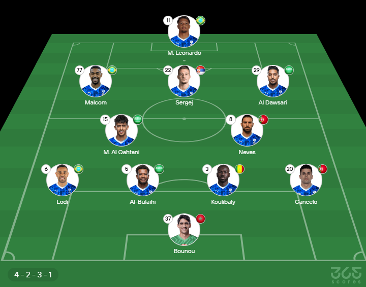 - Provável escalação do Al Hilal: Bounou, Renan Lodi, Al-Bulaihi, Koulibaly e João Cancelo; Al Qahtani, Rúben Neves, Malcom, Sergej Milinkovic-Savic e Al Dawsari; Marcos Leonardo
