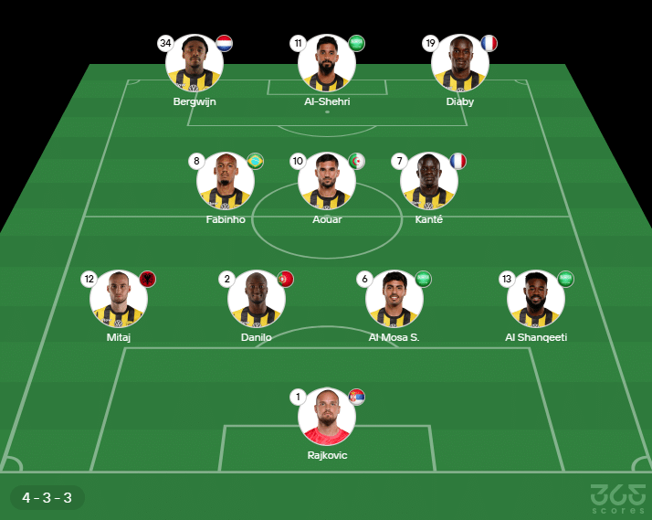 Provável escalação do Al-Ittihad: Rajkovic, Mitaj, Danilo Pereira, Al Mosa e Al Shanqeeti; Fabinho, Aouar e Kanté; Bergwijn, Diaby e Al-Shehri. Técnico: Laurent Blanc.