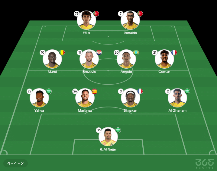 Provável escalação do Al-Nassr: Al Najjar, Yahya, Iñigo Martínez, Simakan e Al Ghanam; Mané, Brozovic, Ângelo e Coman; João Félix e Cristiano Ronaldo. Técnico: João Félix.