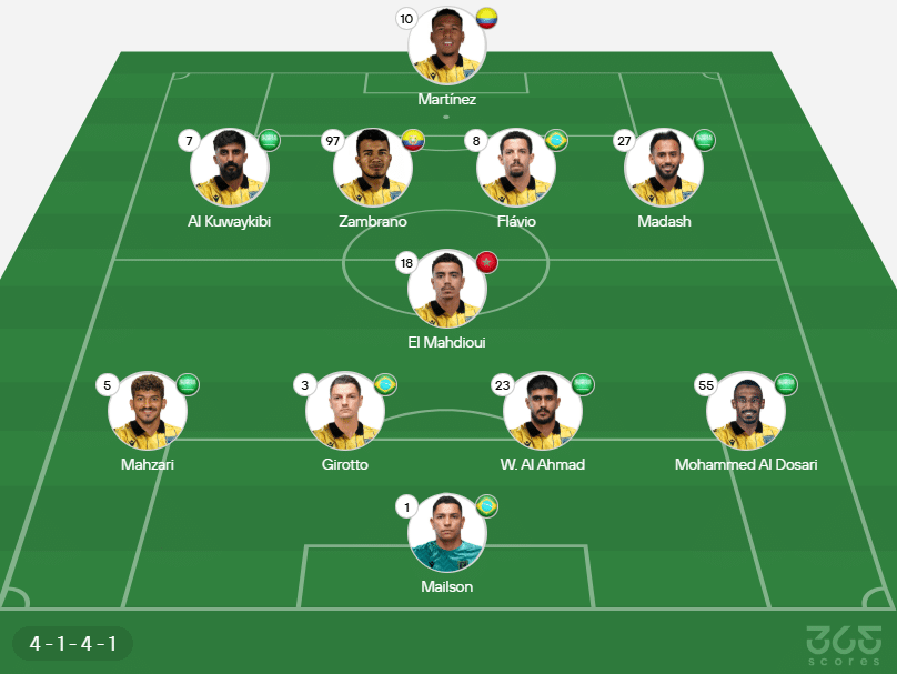 Provável escalação do Al-Taawoun: Mailson; Mohammed Al Dosari, Al Ahmad, Girotto e Mahzari; El Mahdioui; Madash, Flávio, Zambrano e Al Kuwaykibi; Martínez.