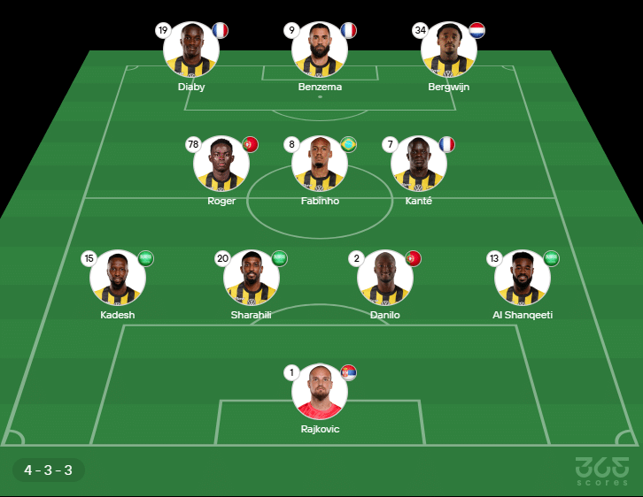 Provável escalação do Al-Ittihad: Rajkovic; Al Shanqueeti, Danilo Pereira, Sharahili, Kadesh; Fabinho, Kanté, Roger Fernandes; Bergwijn, Diaby, Benzema. Técnico: Sérgio Conceição.