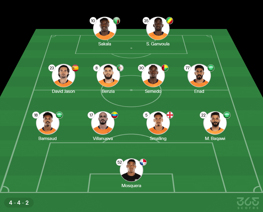 Escalação do Al-Fayha: Mosquera, Baqawi, Smalling, Villanueva e Bamsaud; Enad; Semedo, Benzia e David Jason; Ganvoula e Sakala. Técnico: Pedro Emanuel.