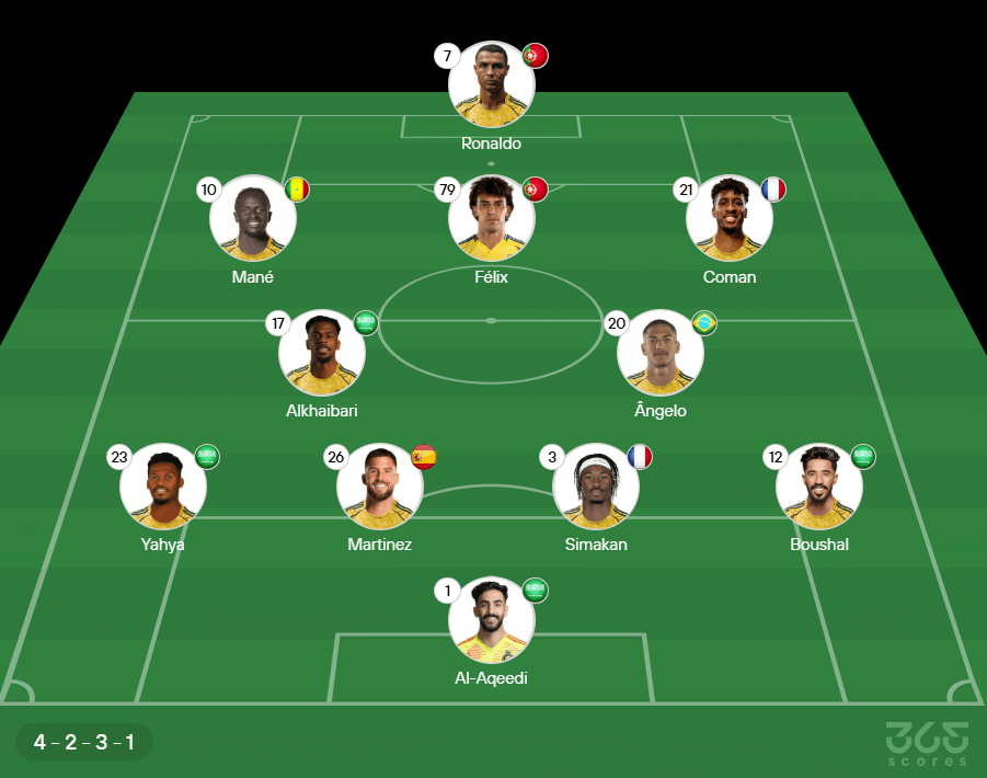 Escalação do Al-Nassr: Al-Aqueedi, Boushal, Iñigo Martínez, Simakan e Yahya; Ângelo, Alkhaibari, Coman, João Félix e Mané; Cristiano Ronaldo. Técnico: Jorge Jesus.