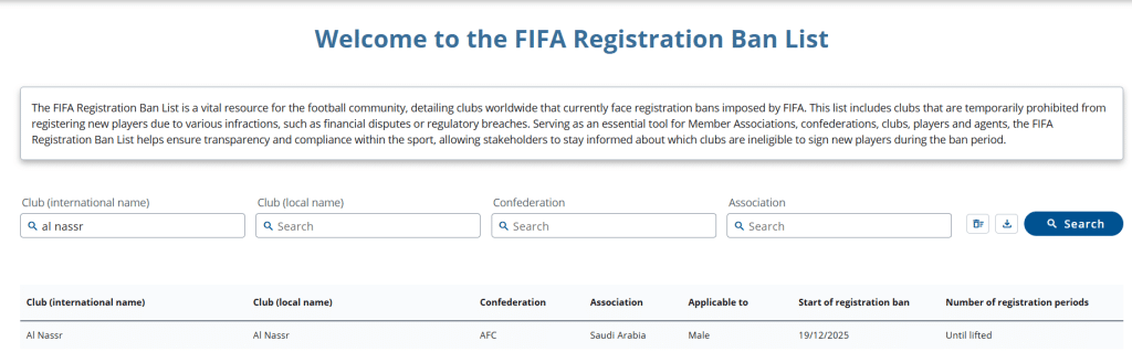 Em 2023, o Al Nassr sofreu um transfer ban da Fifa por três janelas de transferências. O caso foi encerrado após o pagamento de uma multa de dois milhões de euros.