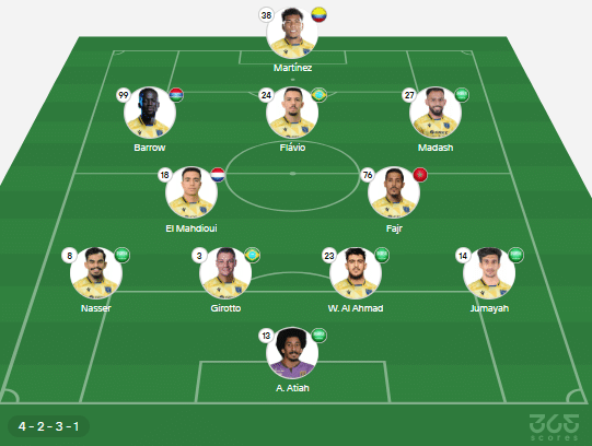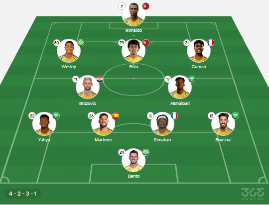 - Provável escalação do Al-Nassr: Bento, Boushal, Simakan, Martínez, Yahya; Aikhaibari, Brozovic, Coman, Wesley, Félix; Cristiano Ronaldo