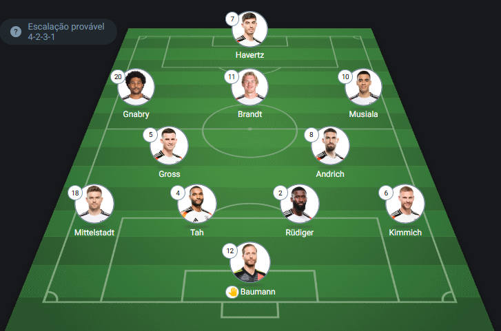 Provável escalação da Alemanha: Baumann, Mittelstadt, Tah, Rüdiger e Kimmich; Gross, Andrich, Gnabry, Brandt e Musiala; Kai Havertz. Técnico: Julian Nagelsmann.