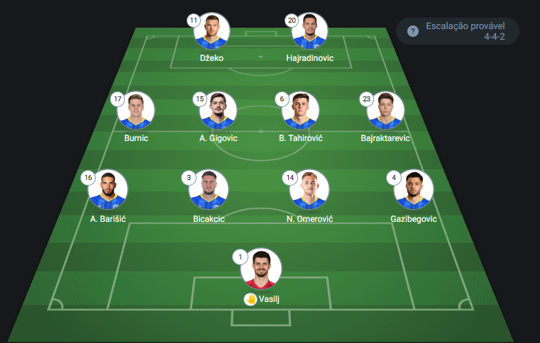- Provável escalação da Bósnia: Vasilj, Barisic, Bicakcic, Omerovic e Gazbibegovic; Burnic, Gigovic, Tahirovic e Bajraktarevic; Dzeko e Hajradinovic