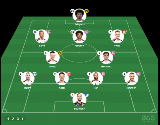 - Provável escalação do Alemanha: Bauermann; Kimmich, Tah, Koch, Raum; Goretzka, Gross, Gnabry; Wirtz, Sané, Adeyemi.