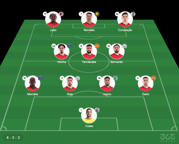 - Provável escalação do Portugal: Costa; Dalot, Inacio, Dias, Mendes; Bernardo, Fernandes, Vitinha; Conceição, Leão, Cristiano Ronaldo