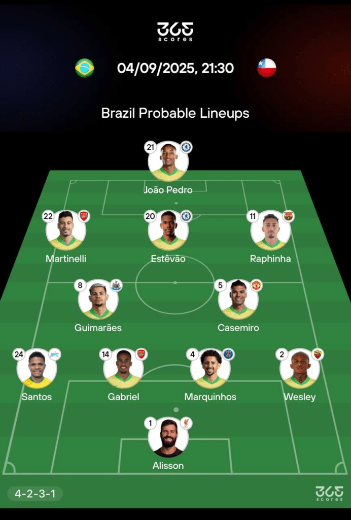 Com quatro atacantes, a formação pensada por Ancelotti é parecida com a que escalou contra o Paraguai. Entretanto, na ocasião o ataque foi formado por Raphinha, Matheus Cunha, Gabriel Martinelli e Vini Jr.