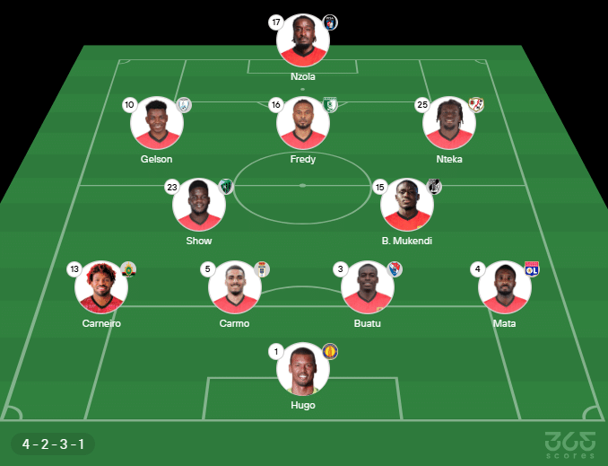 - Provável escalação de Angola: Hugo; Mata, Buatu, Carmo e Carneiro; Mukendi e Show; Nteka, Fredy e Gelson; Nzola